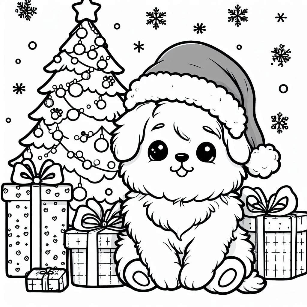 A smiling puppy in a Santa hat surrounded by gifts under a Christmas tree. My youngest decided the fur should be rainbow-colored, calling it “the magic puppy that brings luck.” For me, this page became a quiet companion for evenings by the fireplace.